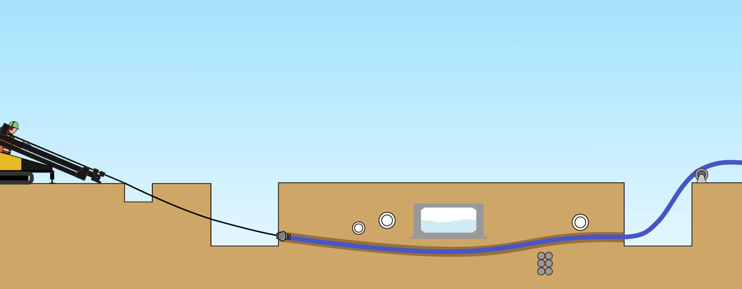 誘導式水平ドリル工法「HDD」は、ガスや上・下水道の圧送に用いられる管路や、電力ケーブルなどの埋設管形成に最適な非開削の工法で、環境保護や安全性に優れ、世界でもっとも多く採用さ れています。 地中内のドリルヘッドは、上下左右自由に方向修正が可能。 地上からロケーターで掘削状況を把握しながら、掘削軌道上に既設されている埋設物を回避することができます。 また、作業スペースや道路状況などに応じて地上設置型、立坑内設置型の掘削機を使い分けることで、さまざまな施工に対応することが出来ます。